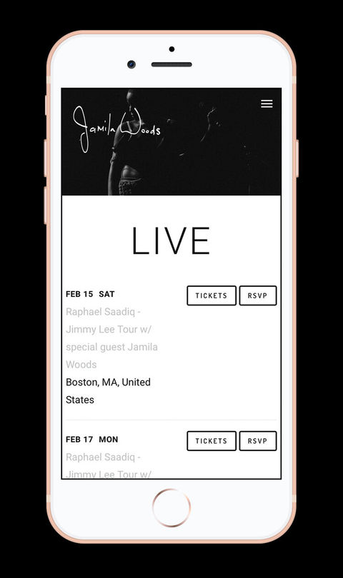 Website acts as the main hub for Jamila Wood’s merch and concert tour dates.